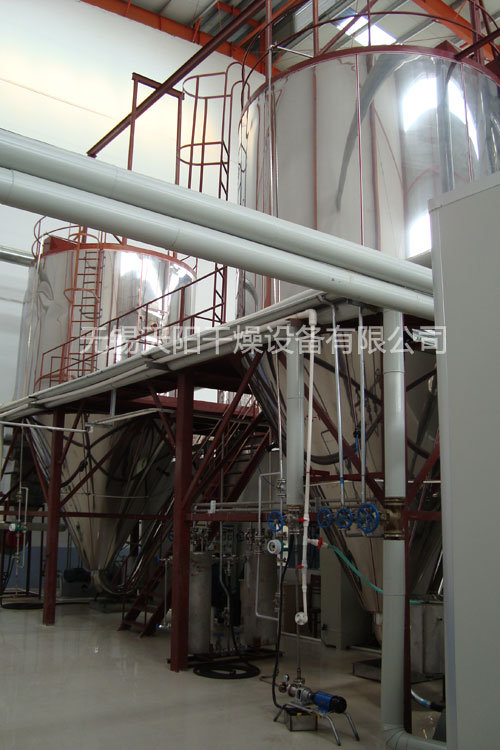 該設(shè)備由供料系統(tǒng)、空氣加熱凈化系統(tǒng)、干燥塔系統(tǒng)、收料系統(tǒng)、控制系統(tǒng)等多個(gè)系統(tǒng)整合而成。主塔系統(tǒng)集中了目前噴霧干燥工程的所有技術(shù),噴干機(jī)組的收料系統(tǒng)由一級旋風(fēng)分離器+布袋除塵器組合形成。一級旋風(fēng)采用高氣量高效率旋風(fēng)進(jìn)行收集,其收粉率能達(dá)到98%左右分,而布袋除塵器是針對蛋白粉類除塵專門設(shè)計(jì)的優(yōu)化設(shè)備,能使物料與風(fēng)進(jìn)行完全分離并沉降,布袋為拒水防油防靜電布袋,過濾目數(shù)可達(dá)500目以上。